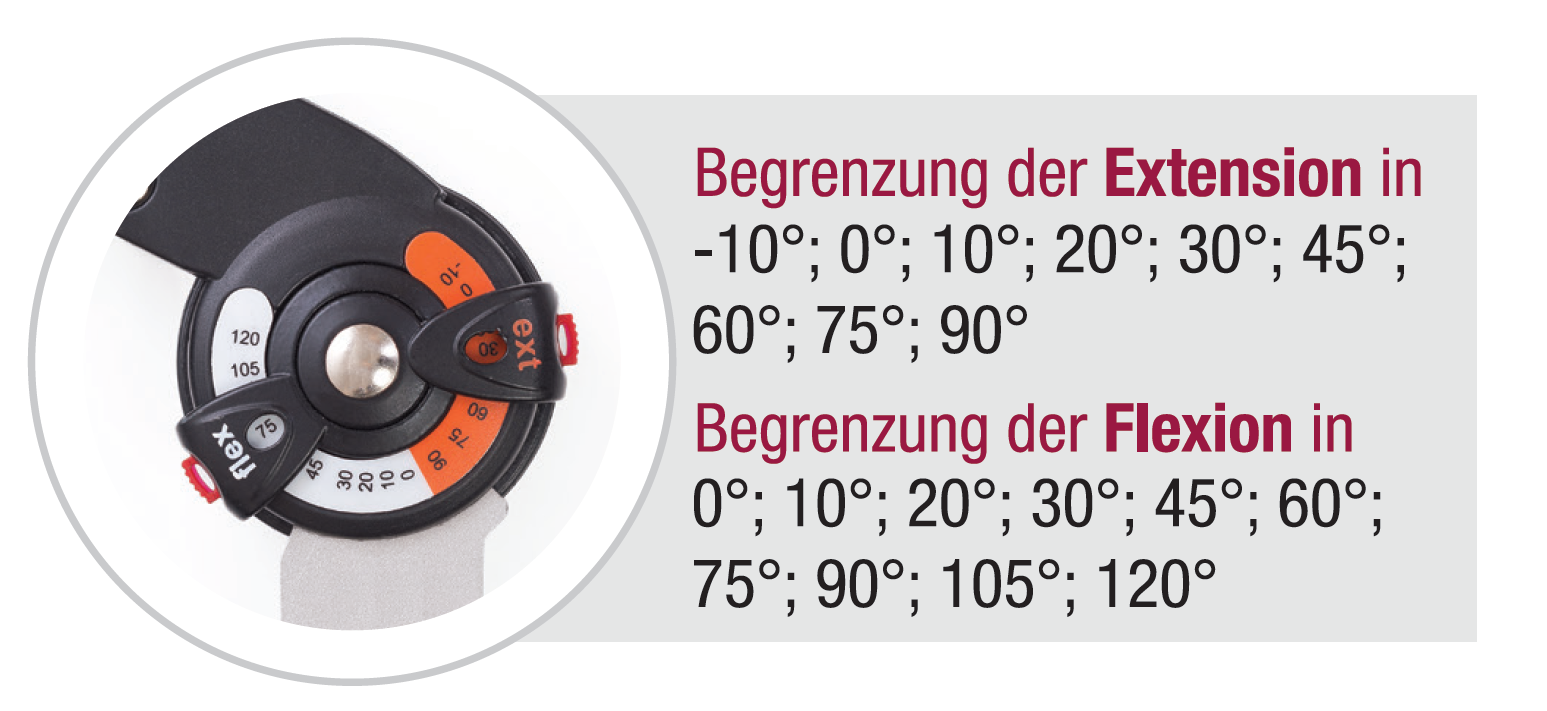 Die einfache und werkzeuglose Einstellfunktion für Flexion und Extension erfolgt durch Fingerdruck und Verschieben bis zum gewünschten