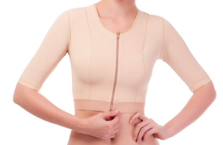 (Lioisuktion) an Oberarmen und Rücken entwickelt. Das Kompressionskorsett mit Ärmeln wird vorn mit einem Reißverschluss verschlossen. für eine einfachere Handhabung ist dieser Reißverschluss zusätzlich mit 3 Haken unterlegt. Die unterfütterte Verschlussleiste gewährleistet eine hohe Tragekomfort.