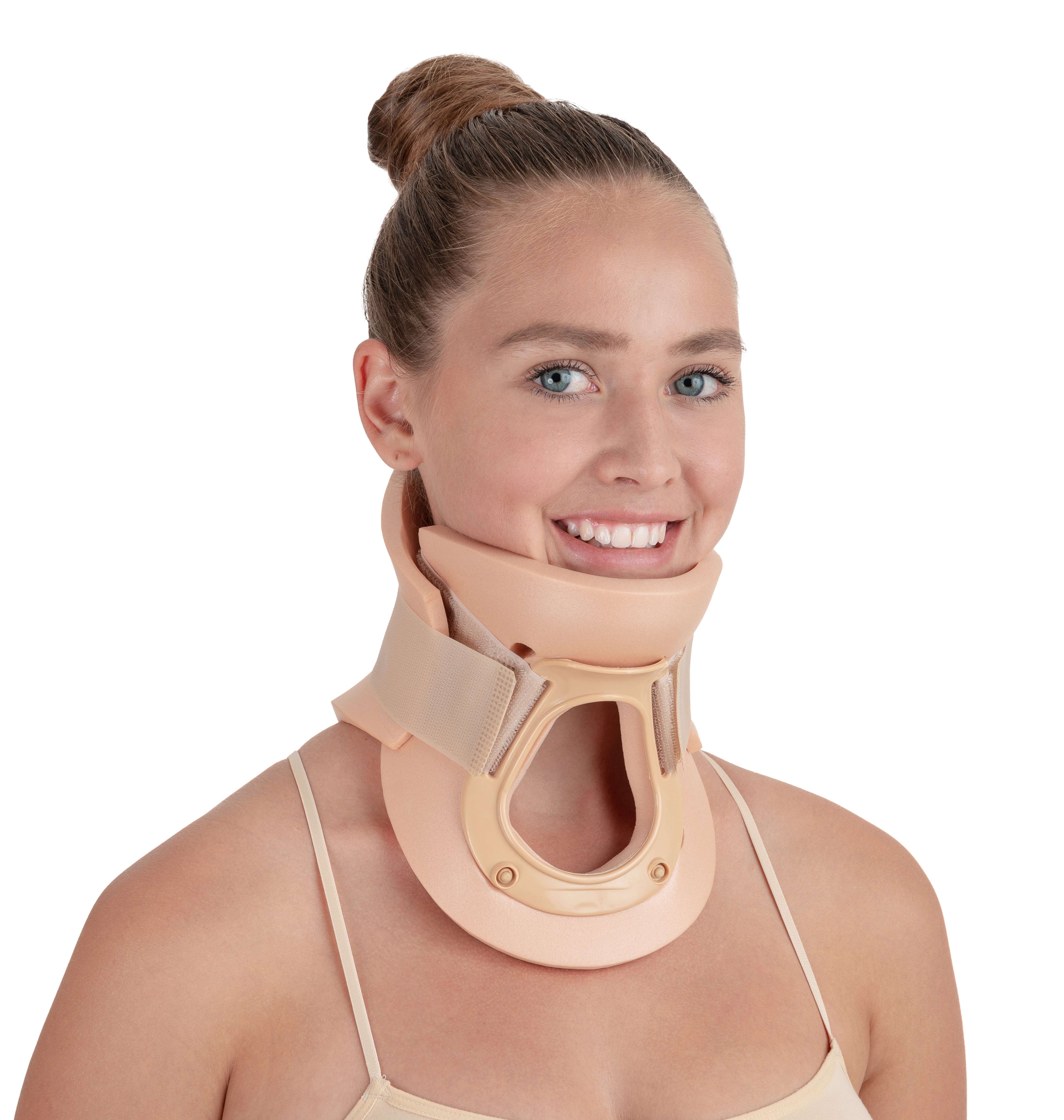 Im Bereich des Kehlkopfes befindet sich eine Öffnung von 50 mm Durchmesser z.B. für eine Trachealkanüle. Die Cerviplas 111 wird nach dem Anlegen mit zwei Klettverschlüssen seitlich fixiert.